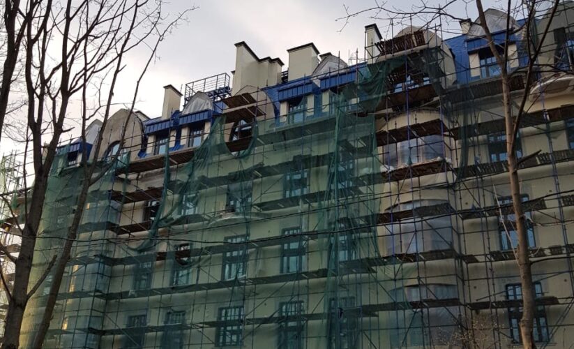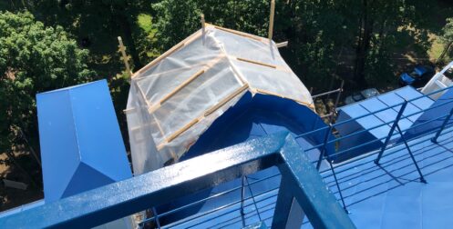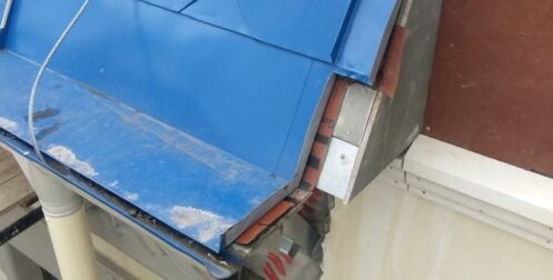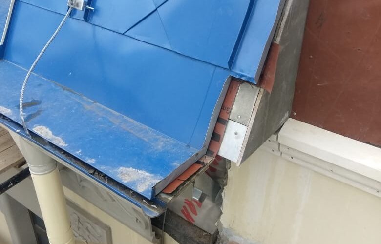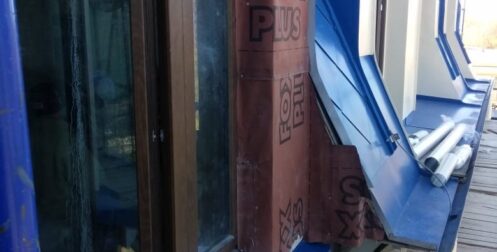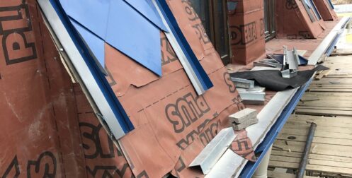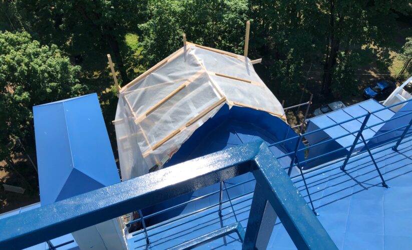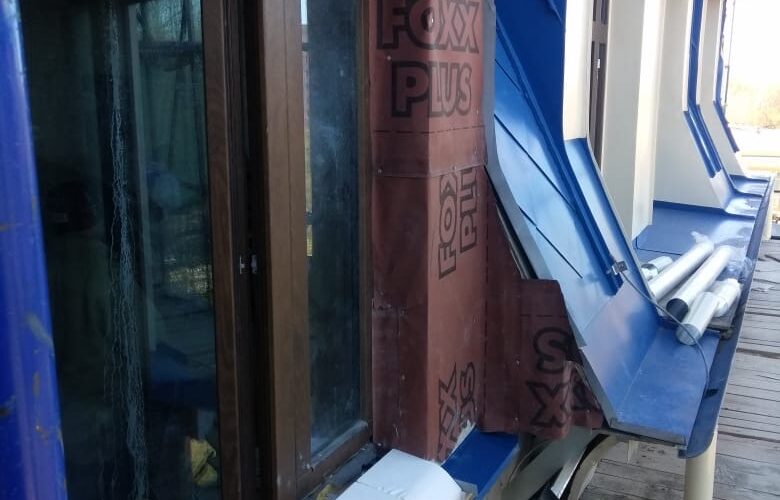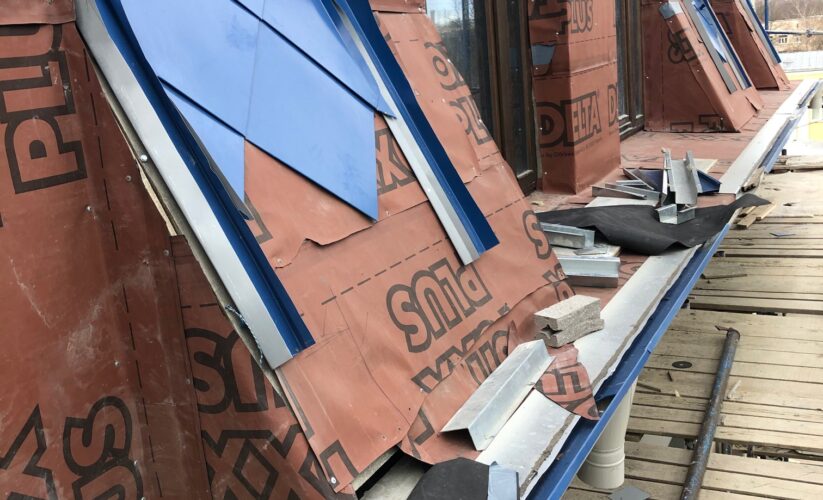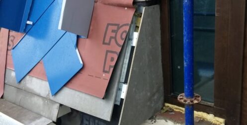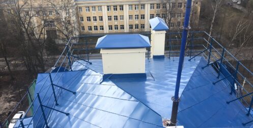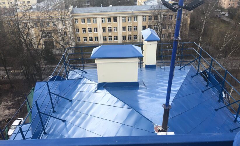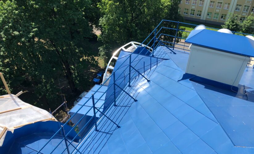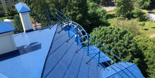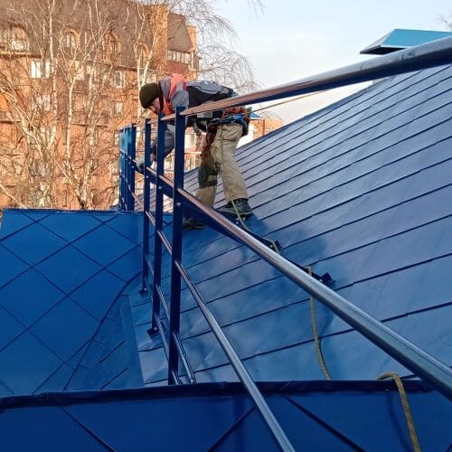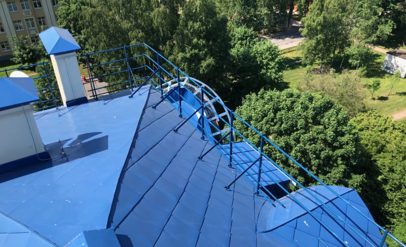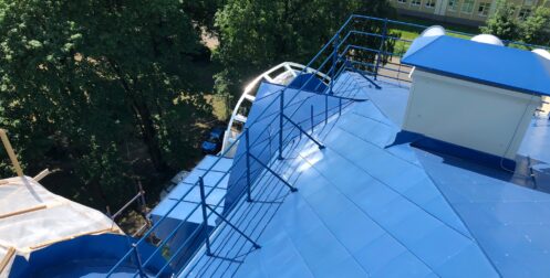 — монтаж совмещенного покрытия шашка и фалец с монтажом фасонных элементов, в качестве кровельного покрытия применялась кровельная сталь с полимерным покрытием Pural толщиной 0,5 мм;